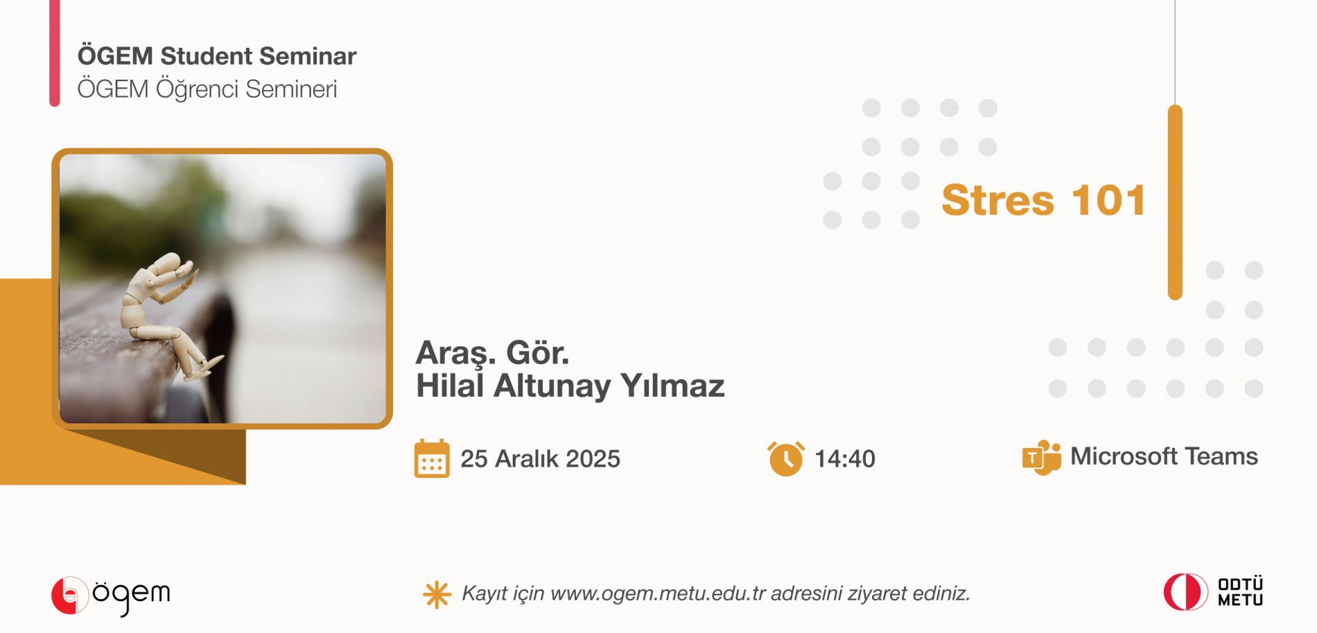 Öğrenme ve Öğretmeyi Geliştirme Merkezi (ÖGEM) tarafından düzenlenen “Stres 101: Mini Çevrimiçi Seminer”, stresin doğasını anlamanıza, stresle baş etme yollarınızı fark etmenize ve gündelik yaşamda uygulanabilir stratejiler öğrenmenize yardımcı olmayı amaçlamaktadır.