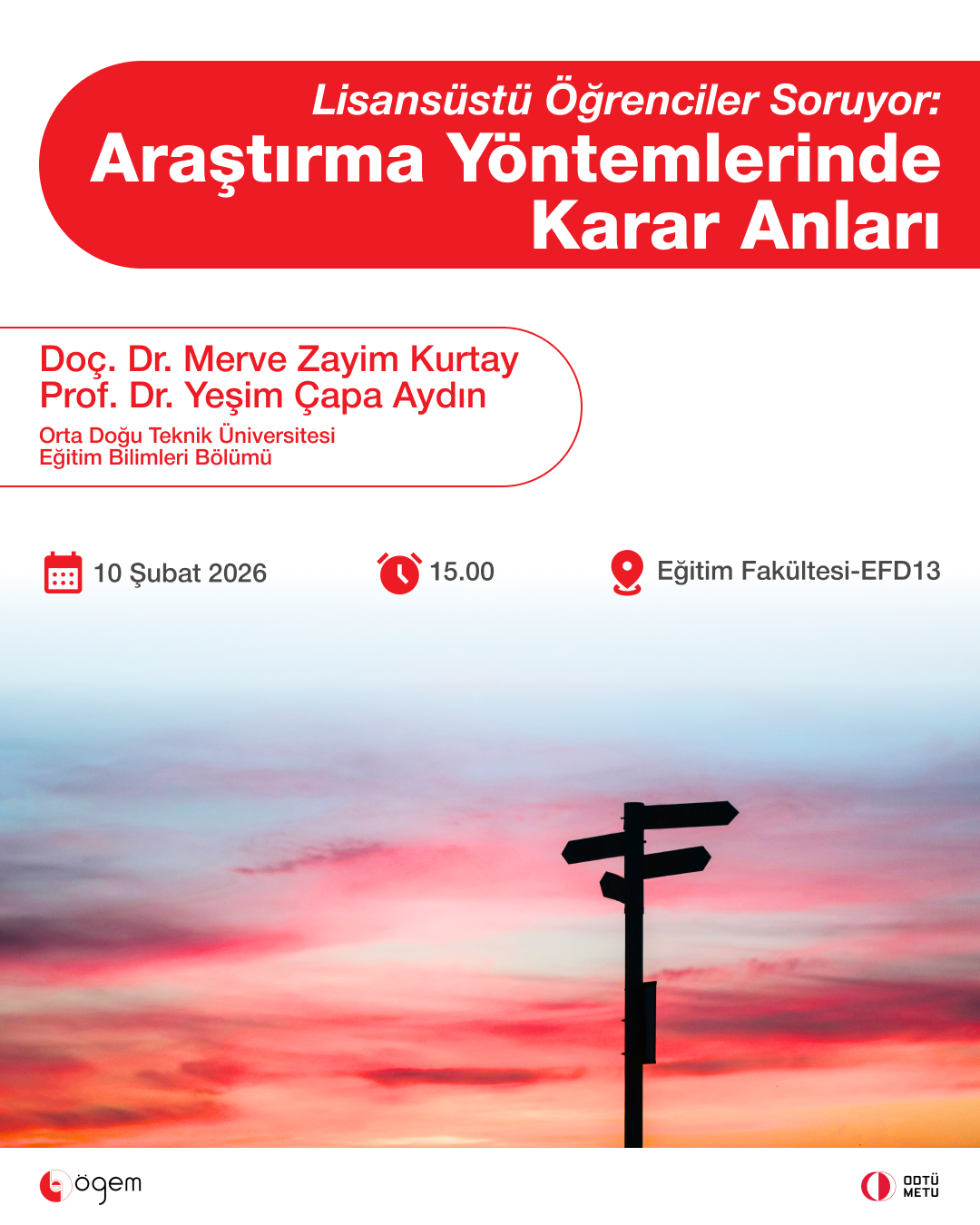 Araştırma Yöntemlerinde Karar Anları çalıştayı, sosyal bilimler alanındaki lisansüstü öğrencilerin araştırma yöntemlerine ilişkin sorularını yönelteceği ve yanıtların uzman akademisyenlerle birlikte tartışılacağı etkileşimli bir buluşmadır. Çalıştayda, araştırma sürecinde verdiğimiz/karşılaşılan yöntem seçimi, veri toplama stratejileri, analiz yaklaşımı, örneklem belirleme ve çalışmanın sınırlılıklarının tanımlanması gibi temel kararlar örneklerle ele alınacaktır. Yürütücüler: Doç. Dr. Merve Zayim Kurtay & Prof. Dr. Yeşim Çapa Aydın |